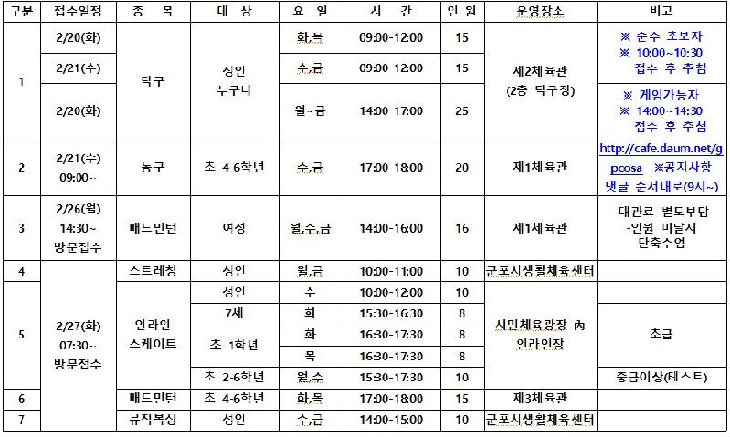 수강신청은 선착순으로 진행되며 농구는 인터넷 카페(cafe.daum.net/gpcosa) 댓글 접수로, 나머지 종목들은 신분증과 상해보험 가입증서(사본)을 가지고 군포시민체육광장에 방문 접수하면 된다. 단, 탁구는 접수 후 공개추첨을 진행한다.