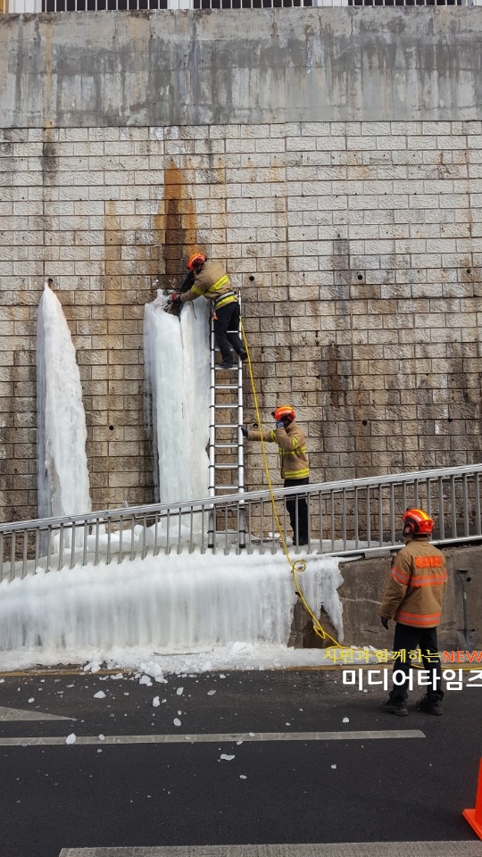 [미디어타임즈=문상수 기자] 인천서부소방서(서장 김준태) 서부119구조대는 지난 19일 오후 1시 33분경 서구 석남동 485-10번지에 위치한 고속도로 옆 일방통행길 옹벽에 대형 고드름이 만들어졌다는 신고를 받고 출동해 대형고드름 제거 및 안전 조치했다.이날 옹벽 배수구에 누수된 물이 얼어 높이 5m 직경 20cm 이상의 고드름이 발생하였으며, 착암기 등을 이용하여 2시간 30분여 만에 제거했다.19일 서부소방서에 따르면 기온이 상승하기 시작한 이달 중순부터 서구지역 상가와 학교 및 연립주택 등 고층건물의 고드름제거 요청이 쇄도하면서 ‘고드름 제거출동’만 65여건에 달하고 있다고 밝혔다.이상준 119구조대장은 “올 겨울 유난히 지속되는 한파로 인해 배수관 동파 사고가 잦아 고드름이 많이 발생했다”며, “해빙기엔 온도가 점차 올라 고드름이 주변에 있다면 낙하사고의 위험성이 높아 행인이나 차량을 덮쳐 큰 사고를 불러 일으킬 수 있으므로 멀리 떨어져 안전을 확보하며 119에 즉시 신고하여 안전조치 할 수 있도록 해야한다.”고 전했다.