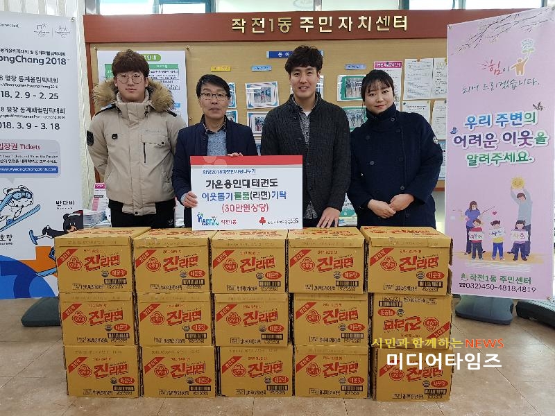 [미디어타임즈=문상수 기자] 인천 계양구 소재 가온용인대태권도장(관장 김동우)은 지난 19일 작전1동 행정복지센터에 라면 15박스(600개)를 기탁했다.위 성품은 가온용인대태권도장 관원들이 선한 행동을 할 때마다 부모에게 10원씩 받아 저금한 돈과 어려운 이웃을 돕기 위한 성금을 모아 마련한 것이다.김동우 관장은 “관원들이 태권도 정신을 바탕으로 올바른 가치관을 함양할 수 있도록 힘쓰고 있으며 이를 위해 적은 돈의 가치, 나눔의 가치를 몸소 체험토록 하고자 2018 따뜻한 사랑나누기 캠페인에 동참하게 되었다”고 밝혔다.한수복 작전1동장은 “각박한 세상에 남을 위해 나눔을 실천한다는 게 쉬운 일이 아님에도 작은 정성들을 모아 성품을 마련하고 나눔을 실천해 주셔서 감사드린다”며 “기탁된 성품은 관내 저소득 장애인 및 독거노인 등 어려운 이웃들에게 잘 전달하도록 하겠다”고 말했다.
