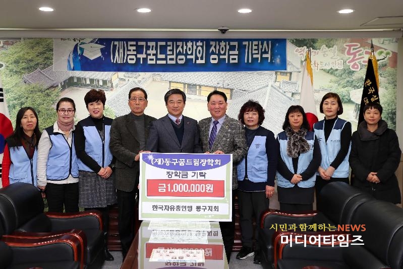 | 자유총연맹 (재)동구꿈드림장학회 장학금 기탁식 사진. <ⓒ미디어타임즈> |