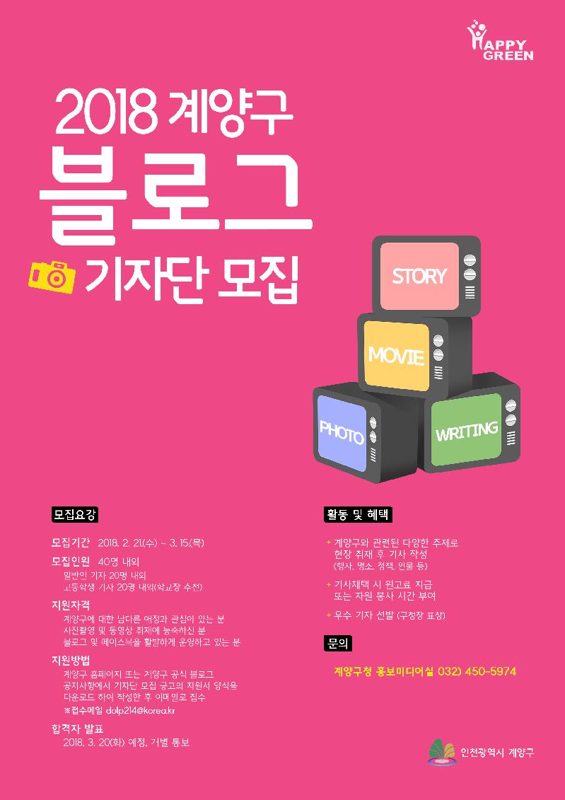 [미디어타임즈=문상수 기자] 인천 계양구(구청장 박형우)는 계양구만의 특별한 소식들을 열정적으로 취재하여 소셜 미디어를 통해 함께 소통하고 활동할 ‘제4기 신비 블로그 기자단’을 모집한다.계양구 블로그 기자단은 그동안 구 소셜 미디어를 통해 계양구의 숨겨진 매력과 자랑하고 싶은 이야기들을 사진과 글, 영상으로 구민들에게 생생하게 전달해왔다. 이번 모집은 일반기자와 학생기자를 나누어 모집하며 ▲계양구에 대한 남다른 관심과 애정이 있는 사람 ▲사진 및 동영상 촬영 등 활발한 취재활동이 가능한 사람 ▲블로그, 페이스북 등 SNS를 운영하고 있는 사람은 누구나 지원할 수 있다. 모집기간은 2월 21일부터 3월 15일까지이다.블로그 기자로 위촉되면 1년간 활동하게 되며, 채택된 기사에 대해 소정의 원고료 및 자원 봉사 시간을 받을 수 있다. 또한, 우수 활동 기자는 연임도 가능하다.구 관계자는 “제4기 신비 블로그 기자단에 참여하실 분은 계양구청 홈페이지 또는 공식 블로그에 게재된 신청서를 작성한 후 전자우편으로 제출하면 된다” 고 전하며, “참신하고 열정적인 분들의 많은 지원을 바란다” 고 말했다.기타 자세한 사항은 계양구청 홍보미디어실(☎032-450-5974)로 문의하면 된다.