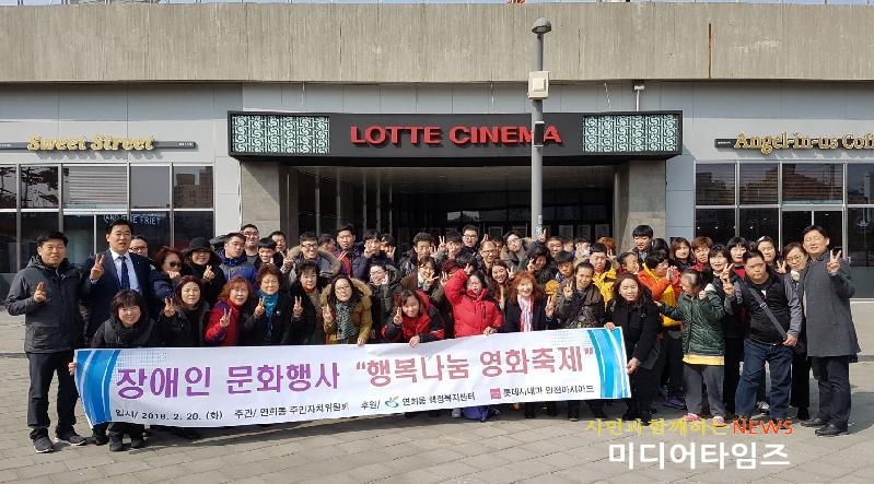 [미디어타임즈=문상수 기자] 인천 서구 연희동주민자치위원회(위원장 조은상)는 지난 20일 관내 장애인과 인솔자 60여명을 대상으로 무료 영화관람을 지원했다. 이번 행사는 연희동주민자치위원회와 롯데시네마 인천아시아드관이 월 1회 저소득 대상자에 무료 영화관람을 지원하는 업무협약 체결을 통해 지역복지사업으로 추진됐다. 이날 영화축제에서는 연희동 복지위원들이 장애인들을 편안하고 안전하게 인솔하며 함께하여 더불어 행복한 마음을 나누는 분위기를 조성함으로써 더욱 뜻깊은 자리가 됐다. 이날 영화축제에 참여한 대상자는 “영화를 볼 기회가 많이 없는데 참여하게 되어 좋은 경험이 됐다. 이런 기회가 자주 있었으면 좋겠다”며 이번 행사를 준비한 롯데시네마 인천아시아드관과 연희동주민자치위원회에 감사의 뜻을 전했다. 이번 행사를 주관한 조은상 주민자치위원장은 “관내 장애인분들이 너무 즐거워하시는 모습에 오늘과 같은 행사를 더욱 확대해야겠다는 생각이 들었다”며, “오늘 행사를 도와주신 롯데시네마 인천아시아드관과 관내 장애인분과 동행해주신 복지위원분들께도 감사드린다”고 말했다.