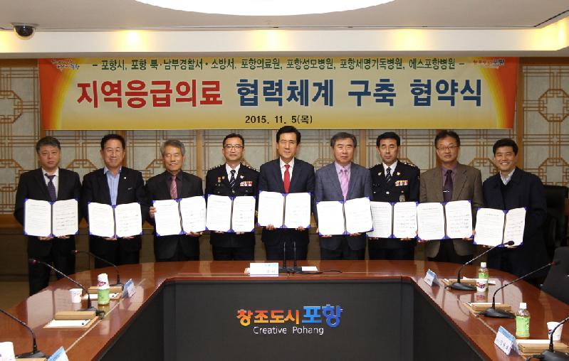 포항시가 5일 시청 중회의실에서 선린병원 부도로 인한 지역의료현안 해결을 위해 남․북부경찰서, 남․북부소방서, 포항의료원, 포항성모병원, 포항세명기독병원, 에스포항병원과 지역응급의료 협력체계 구축 업무협약을 체결했다.