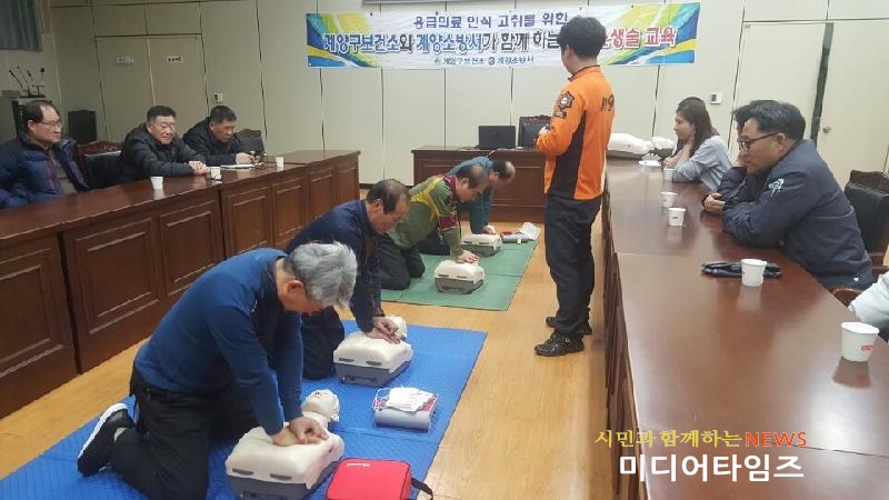 [미디어타임즈=문상수 기자] 인천 계양구보건소(구청장 박형우)는 21일 2차에 걸쳐 계양소방서 소회의실에서 자동심장충격기 설치 의무대상시설인 공동주택(500세대 이상) 관리책임자 대상으로 심폐소생술 및 자동심장충격기 사용법 교육을 실시했다.이번 2018년 심폐소생술 교육 과정은 응급의료 인식 고취를 위해 계양구보건소와 계양소방서가 함께 하였으며, 응급상황에서 119구급차 도착 전까지 소중한 생명을 살리는 데 중요한 심폐소생술(CPR) 및 자동심장충격기 사용법 등을 교육함으로써 공동주택을 관리하는 관리자 및 근무자들에게 응급상황에서 실제로 지역주민 등에게 사용할 수 있는 능력을 배양하기 위해 운영됐다.이번 교육은 심폐소생술 및 응급처치 교육, 119 이용 홍보 등을 주제로 30여명의 공동주택 관리자가 참여했다. 심폐소생술 PPT 및 동영상 시청, 초기 심폐소생술의 응급처치 필요성, 심폐소생술 실습교육, 자동심장충격기 사용법 숙지, 응급상황 시 119구급차 이용 홍보 등의 교육과정이 진행됐으며 심폐소생술을 시연함으로써 응급처치의 필요성에 대하여 다시 한번 생각하게 되는 계기가 되었다.보건소 관계자는 “2018년 심폐소생술 교육을 통해 응급의료 필요성 및 인식 강화, 더 나아가 안전 계양구를 확립하는 데 주도적인 역할을 수행할 수 있기를 기대한다” 라고 말했다.
