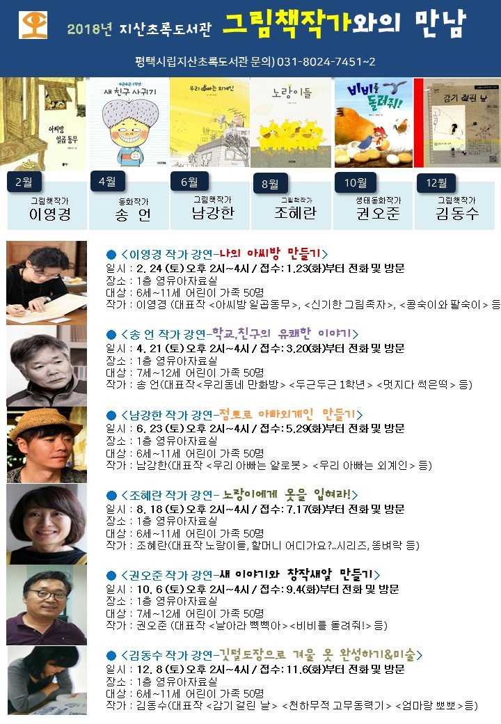 [미디어타임즈= 이옥수 기자] 평택시 지산초록도서관는 2018년‘그림책작가와의 만남’을 격월로 연다. 지난해(2017년)부터 시작한 특화사업으로, 시민들의 큰 호응도을 얻었으며, 어린이가족들을 대상으로 작가의 책 이야기와 체험행사를 진행한다.