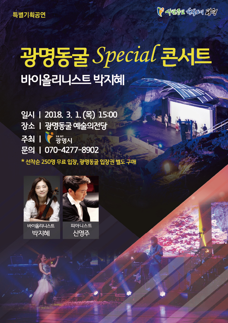 [미디어타임즈= 신훈종 기자] 광명시가 오는 3월 1일(목) 오후 3시 광명동굴 예술의 전당에서 3·1절 99주년 기념행사로 ‘2018 광명동굴 스페셜 콘서트’를 연다고 밝혔다.