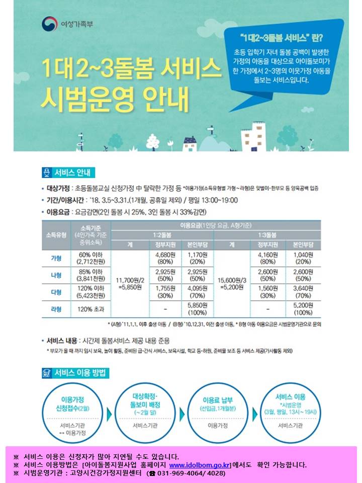[미디어타임즈= 이옥수 기자] 고양시(시장 최성) 건강가정지원센터는 초등 입학기 자녀 돌봄 공백이 발생한 가정의 아동을 대상으로 아이돌보미가 한 가정에서 2∼3명의 이웃가정 아동을 돌보는 ‘1대 2∼3돌봄 서비스’를 시범운영 한다.