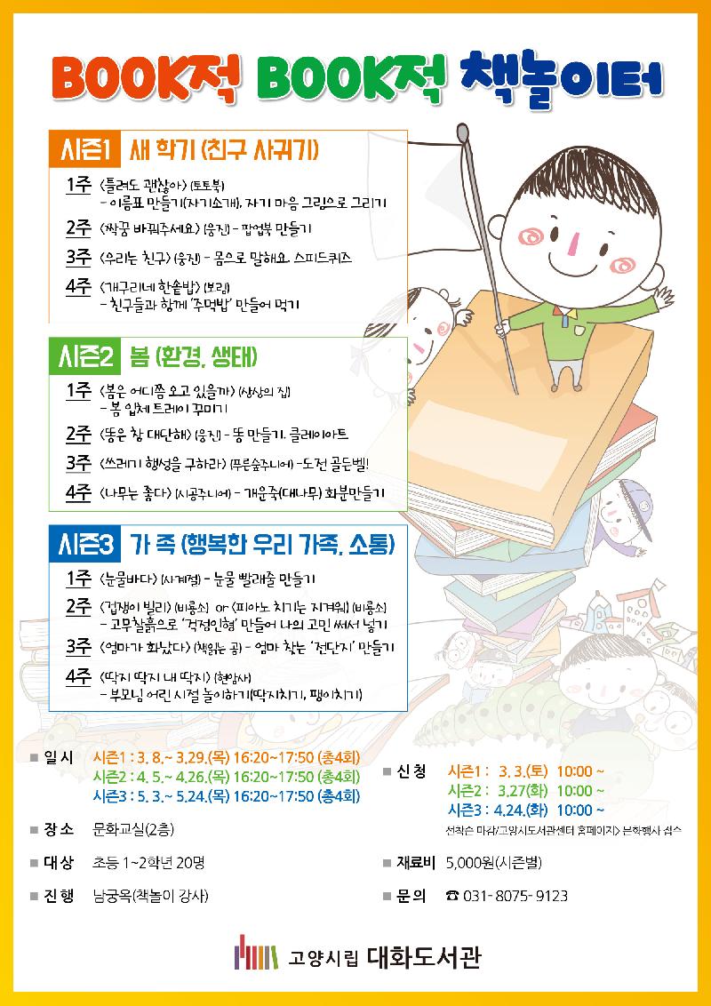 [미디어타임즈= 이옥수 기자] 고양시(시장 최성) 대화도서관은 오는 3월 8일부터 5월 24일까지 초등학생 1~2학년을 대상으로 ‘BOOK적 BOOK적 책 놀이터’를 운영한다. ‘BOOK적 BOOK적 책 놀이터’는 시즌 1, 2, 3회에 걸쳐 각각의 주제로 4회씩 진행될 예정이다.
