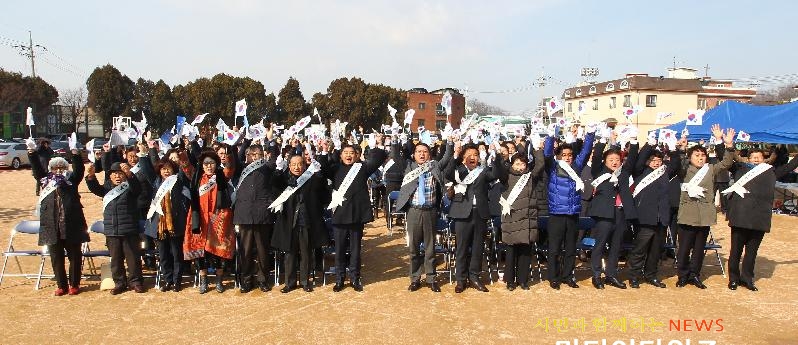 | 광명시의 3·1운동 최초 발상지인 온신 초등학교에서 열린 기념행사에서 참석자들이 만세 삼창을 하고 있다. <사진=저작권자 ⓒ미디어타임즈> |