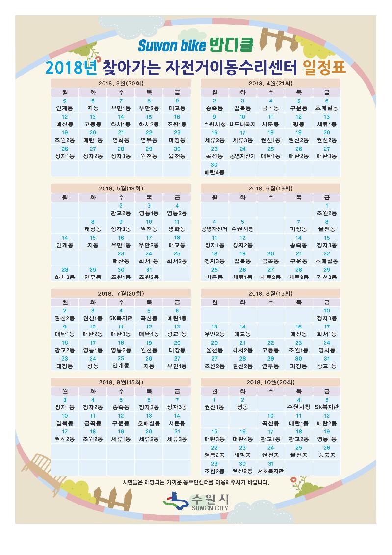 찾아가는 자전거 이동수리센터 운영일정은 수원시청 홈페이지(http://www.suwon.go.kr) ‘교통→자전거’ 게시판에서 볼 수 있다.