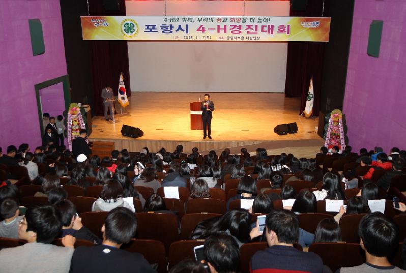 포항시농업기술센터와 포항시4-H회는 7일 시립중앙아트홀에서 4-H인의 화합과 발전을 도모하고 종합경진 등 기량을 겨루기 위한 ‘4-H경진대회’를 성황리에 개최했다. 이날 행사는 영농4-H회원과 중앙고등학교를 비롯한 관내 10개 고등학교 학생4-H회원 및 4-H지도교사, 내빈 등 300여명이 참석했다. 이날 경진대회는 4-H그림그리기, UCC경진, 회원과제 활동사진, 학생4-H회원과제활동, 특기자랑 등으로 진행됐다. 또한 이날은 4-H본부임원 2명과 4-H지도교사 10명에게 감사패를 수여하고, 4-H회원 10개교 10명에게 장학금을 전달했다. 이와 함께 이날 경진대회에서 입상한 5개 경진종목 16점에 대한 시상을 진행했다. 이강덕 포항시장은 “4-H연합회는 우리나라 해방과 함께 도입된 최초의 농업인단체로서 농촌 근대화의 선두 주자로 지역발전을 가속화시켰다”며 “이번 제60회 4-H경진대회를 계기로 4-H회원들이 건전한 청소년으로 성장하고 지역과 사회발전을 위해 큰 역할을 할 수 있는 성인으로 성장하기를 바란다”고 말했다.