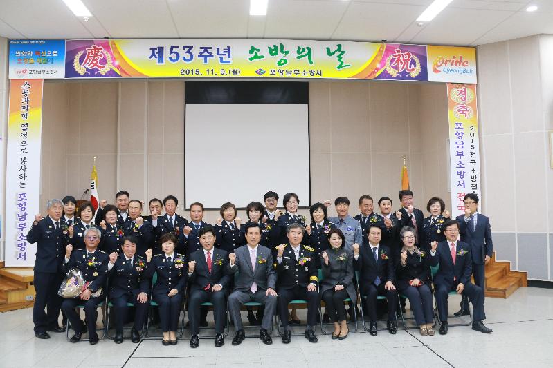 김학태 포항남부소방서장 제53주년 소방의 날을 맞아 소방의 희생,봉사 정신을 새롭게 다지고 시민에게 사랑받는 생활속의 119로 성장하기 위해 최선을 다해줄 것을 당부하였고, 이강덕 포항시장은“전국 화재진압 능력대회에서 1등을 거둔 포항남부소방서 직원들이 자랑스럽고 포항시민의 한사람으로써 든든하고 고마운 마음을 가진다”고 격려하였다.