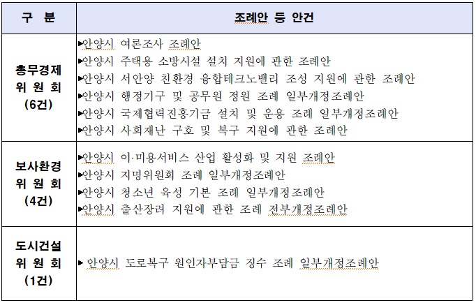 이번 임시회에서는‘안양시 여론조사 조례안 ’등 총무경제 위원회 의원 발의 및 집행부 제출 조례안 6건, ‘안양시 출산장려 지원에 관한 조례 전부개정조례안 ’등 보건환경 위원회 의원 발의 및 집행부 제출 동의안 4건, 도시건설 위원회 ‘안양시 도로복구 원인자부담금 징수 조례 일부개정조례안’등 모두 11건의 안건을 심사할 계획이다.