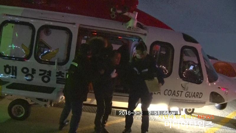 [미디어타임즈=문상수 기자] 중부지방해양경찰청(청장 박찬현) 항공단(영종도 소재)은 주말에도 서해5도 주민들의 안전과 생명을 위해 하늘의 앰뷸런스 역활을 톡톡히 해내고 있다. 중부지방해경양경찰청은 지난2일 23시 57분경 인천시 옹진군 백령도에 오른손 엄지 절단환자가 있다는 신고를 접수하고 헬기(B-517호)를 긴급 출동 시켰다. 이날 중부해경은 헬기를 백령도에 급파하여 3일 02시 48분 환자와 보호자를 인천의 한 병원으로 안전하게 이송하였다. 중부해경청 회전익항공대의 이현석 응급구조사는 “빠른 접합수술을 요하는 환자를 신속하게 이송할 수 있게 되어 보람되었다며 환자의 빠른 쾌유를 바란다”라고 말했다.