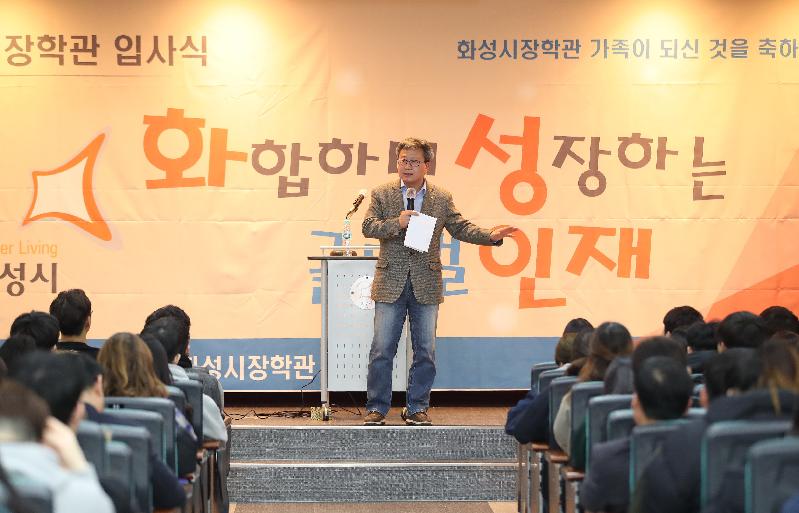 | 지난 3일 서울교통문화교육에서 열린 2018 화성시 장학관 입사식에서 채인석 화성시장이 학생들을 대상으로 특강을 하고 있다. |