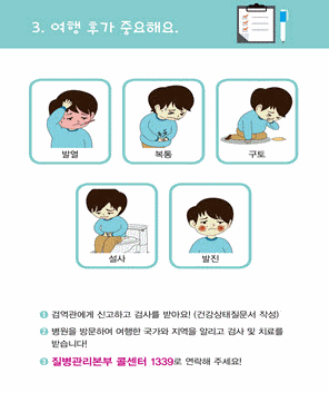 아울러 동남아시아 여행 후 발생한 설사 감염병 환자를 진료한 의료기관에서는 지체 없이 관할 보건소로 신고할 것을 당부하면서 질병 정보에 대해 궁금한 사항이 있을 경우 질병관리본부 콜센터(☎1339)로 문의하도록 안내하였다.