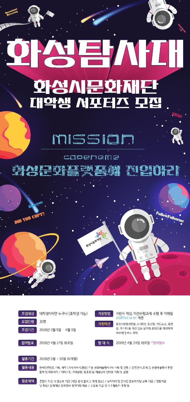 화성시문화재단(대표이사 권영후)에서 5일부터 2018년을 함께할 대학생 서포터즈를 모집한다.