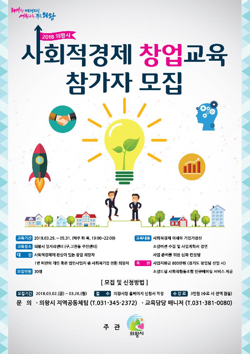 사회적경제 창업교육은 실무․현장 교육과 업종 모델별 사업개발 프로젝트 작성 등 코칭 교육, 지역사회조직 및 자원을 연계한 네트워크 형성과 향후 경기도 창업오디션 참여를 위한 실질 교육 위주로 진행되며, 모집인원은 30명이다. 교육은 3월 29일부터 5월 31일까지 매주 화·목요일 저녁 7시부터 10시까지 3시간씩 10주 과정으로 의왕시일자리센터 회의실(구 고천동주민센터)에서 진행한다.
