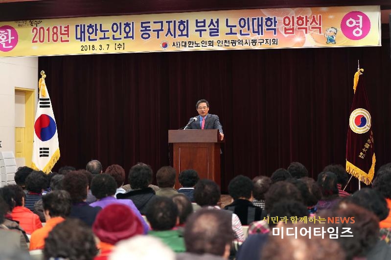 [미디어타임즈=문상수 기자] 인천 동구(구청장 이흥수)는 7일, 동구 노인복지관에서 이흥수 동구청장을 비롯한 내빈과 노인 대학생 및 지역 어르신 등 200여 명이 참석한 가운데 대한노인회 동구지회 부설 노인대학 입학식을 개최했다.노인대학은 고령사회에 접어들면서 어르신들이 건강 프로그램에 적극 참여함으로써 활력이 넘치는 노인문화 조성으로 행복하고 건강한 복지사회를 만들고자 대한노인회 동구지회에서 운영하고 있다.이날 입학식은 1년 간 노인대학에 꾸준히 참여할 어르신들을 격려하고, 건강하고 행복한 화합 분위기를 조성하고 어르신들이 존경받는 사회를 구현하고자 마련됐으며, 기념사 와 축사 등 공식행사를 진행하며 입학의 영광을 함께 축하했다.구 관계자는 “무언가를 배워나가는 과정에서 행복과 즐거움을 느끼는 어르신들이 많다”며 “앞으로도 더욱 많은 어르신들이 노인대학을 통해 배움의 기쁨을 누릴 수 있도록 노력하겠다”고 말했다.한편 노인대학은 요가교실, 건강백세체조, 노래교실, 문화체험 등 다양한 강좌들이 매주 수요일 동구노인복지회관에서 10시부터 16시까지 운영되며 여가선용 및 건강 유지를 원하는 노인들은 연 초 모집기간에 대한노인회 동구지회(032-773-6404)로 신청하면 참여가 가능하다.
