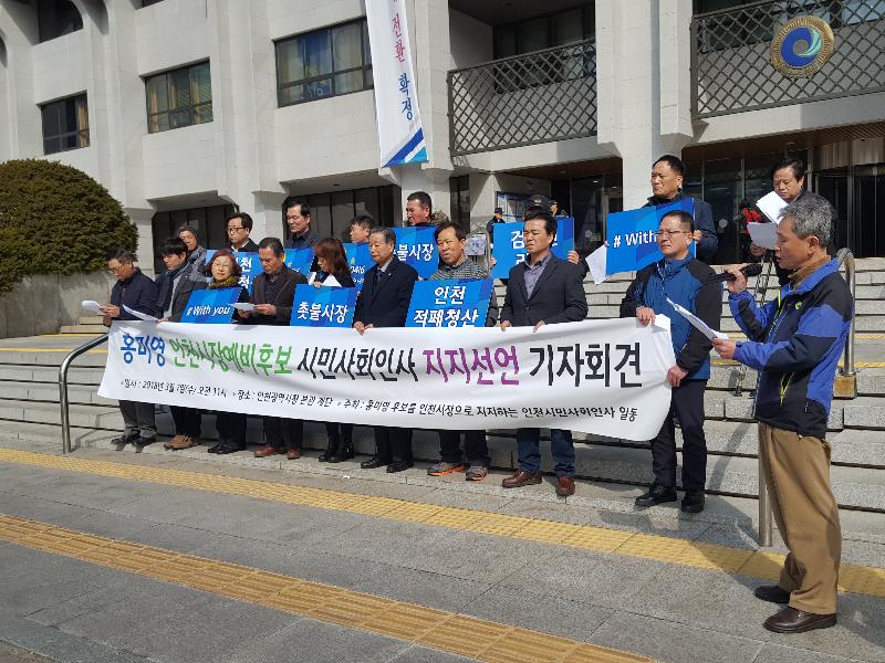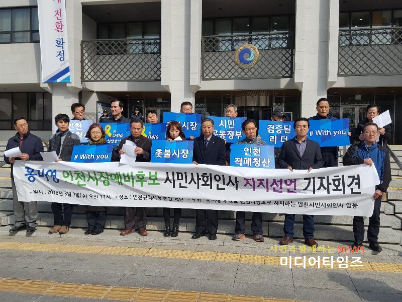 [미디어타임즈=문상수 기자] 인천지역 시민사회단체 인사들이 6.13 지방선거를 앞두고 더불어민주당 홍미영 인천시장 예비후보를 적극 지지하고 나섰다. 이강일 6.15 인천본부상임대표, 이총각 청솔의 집 대표 등 300여 명은 7일 인천시청 현관 앞에서 열린 ‘홍미영 후보를 인천시장으로 지지하는 인천시민사회인사 기자회견’을 통해 이번 지방선거에서 홍미영 전 부평구청장을 촛불시장으로 지지할 계획이라고 밝혔다.이들 인사들은 기자회견문을 통해 “홍미영 후보가 권한을 독점하는 시장이 아니라 민관공동 지방정부를 구성, 시민에게 권력을 돌려주고 행정의 주인으로 섬기는 분권형 시장을 선언했다”며 높이 평가했다. 지난 30여 년간 빈민운동, 여성운동을 시민사회운동진영과 함께 했을 뿐만 아니라, 전국 최초의 야당출신 여성단체장이자 재선 구청장으로서 능력이 검증된 여성정치인이라고 강조했다. 전두환 독재정권에 맞서 1986년 5.3인천민중항쟁과 87년 6.10민주화운동을 벌인 홍미영 후보가 촛불혁명을 계승 발전시켜나갈 적임자라고 덧붙였다.이들 단체들은 적폐청산과 숙의민주주의 실현을 위해 인천시민사회와 민주적 진보개혁 제 정당이 모든 차이를 극복하고 연대, 지방분권시대의 적임자 홍미영 민주당 후보가 더불어민주당 인천시장 촛불후보가 되도록 최선을 다할 것이라고 밝혔다.더불어, 민주당이 후보공천과정에서 성평등 후보에 대한 기준을 마련하고, 광역단체장 여성할당제를 도입, 성평등 달성이 민주주의의 완성임을 보여 달라고 촉구했다.이들은 인천 시민사회도 촛불시대에 맞게 헌법이 시민중심의 민주성을 확대하고 권력분산과 지방정부의 권한을 강화하는 방향으로 개헌이 되게 노력하겠다고 다짐했다.이번 지지서명에는 김병상·호인수 신부, 박종렬·조화순 목사, 유동우 전 한국기독노동자연맹 총회장, 이강일 6.15인천본부 상임대표, 이총각 청솔의 집 대표, 정동근 인천희망 개인택시 회장, 양선화 변호사를 비롯한 교육, 여성, 노동, 평화·통일, 문화예술, 인권·복지, 종교 단체 관계자 들이 대거 동참했다.