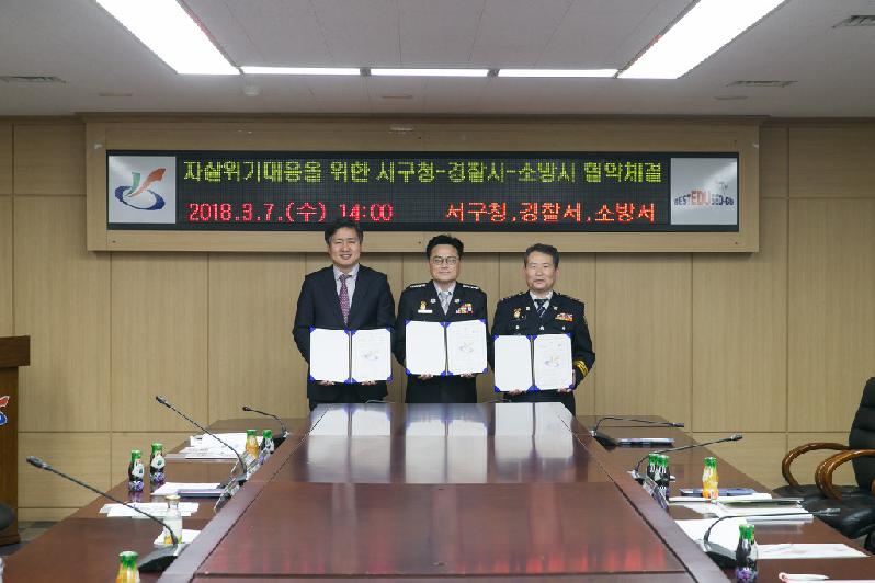[미디어타임즈=문상수 기자] 인천서부소방서(서장 김준태)는 자살위기대응 및 사후관리 체계 마련을 위한 자살예방 및 생명존중 문화조성을 위해 7일 오후 2시 서구청 소회의실에서 서구청, 서부경찰서와 상호 업무협약(MOU)을 체결했다.이 협약은 청소년에서부터 여성․노인에 이르기까지 전 연령대가 자살의 위험에 노출돼 있는 현 상황을 타개하고 응급위기관리체계를 구축해 행복한 서구를 만들기 위해 세 기관이 힘을 모으기로 했다.협약에 따라 서구청에서는 자살고위험군 발굴 및 등록상담 관리 등 정신건강증진에 필요한 사업을 지원해 자살예방 및 사후관리체계를 구축하고 이에 따른 서비스를 시행해 생명존중문화를 확산하게 되며,서부경찰서에서는 정신과적 문제, 자살고위험군 서비스를 연계하여 자살 시도자 및 유가족에 대한 정보를 공유해 추후 발생할 수 있는 위험성을 감소시키기 위한 안전망을 구축해 자살을 줄여나가게 된다.서부소방서에서는 119구급대에 의해 이송되는 자살시도자 의뢰 등을 통해 자살위기 상황 발생 시 긴급출동해 대상자를 구조·구급 및 정신보건센터와 협력해 자살 재발방지 등 사후관리에 협력하게 된다.최근 일년 동안 서구에서 자살한 사람은 81명으로, 작년보다 13명이 증가하였으며 점점 늘어가고 있는 실정이다 또한 우리나라 자살 사망률(인구 10만명 당)은 26.5명으로 OECD국가 가운데 8년 연속 자살률 1위 오명을 쓰고 있다.이번 업무협약 체결로 생명사랑, 생명존중 네트워크가 가동됨으로서 자살문제에 역동적으로 대응해 주민의 소중한 생명을 보호하는데 크게 기여할 것으로 기대하고 있다.