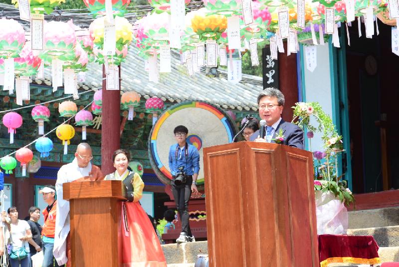 채인석 시장은 축사를 통해 “오늘은 부처님께서 이 세상에 오셔서 모든 중생에게 깨달음의 길을 여신 날”이라며, “부처님의 가르침대로 나를 기뻐하고 남을 이해하며, 나를 좋아하고 남을 사랑하며, 욕심을 버리고 지금 있는 그대로를 만족하며 그렇게 웃을 수 있으면 좋겠다”며, “우리의 이웃과 사회, 그리고 지역과 국가에 화해와 통합의 미덕을 꽃피우는 정성어린 자리가 되기를 바란다”고 말했다.