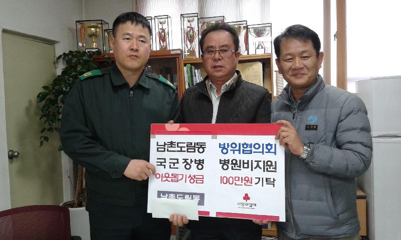 남촌도림동 방위협의회(회장 음성만)는 이금섭 남촌도림동대장으로부터 상근예비역 상병의 아버지가 지난달 9일 심장마비로 쓰러져 현재 입원중이며, 형편이 어려운 가운데 일천만원이 넘는 병원비로 생계가 어렵다는 딱한 사정을 전해 듣고 병원비를 지원하게 됐다.