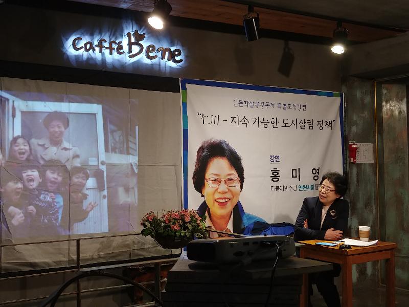 | 홍미영 인천시장 예비후보가 7일 밤 연수구의 한 카페에서 숙박행정의 일환으로 생활정치에 대한 강연을 하고 있다. <ⓒ미디어타임즈> |