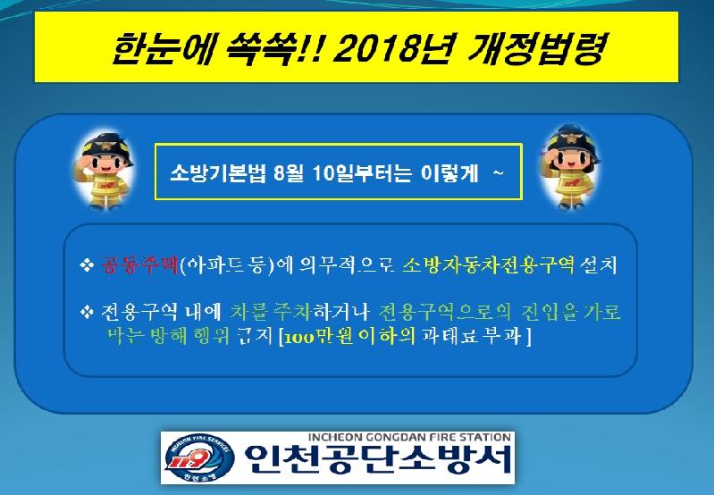 [미디어타임즈=문상수 기자] 인천공단소방서(서장 안영석)는 2018년부터 달라지는 소방관련 법령에 대해 적극 홍보에 나선다.소방서에 따르면 지난 12월에 개정된 소방기본법에 따라 올해 6월 27일부터 화재 등 재난현장으로 출동하는 소방차량에 길을 터주지 않는 운전자에게는 최대 200만원의 과태료가 부과된다.또한, 8월 10일부터는 공동주택(아파트 등)에 소방자동차 전용구역을 설치하여야 하는데 이를 어기고 주차하거나 진입을 가로막는 경우 등의 방해행위를 한 경우 100만원 이하의 과태료를 부과한다.올해 1월부터 시행된『화재예방, 소방시설 설치유지 및 안전관리에 관한 법률』에 따라 공동주택 등 고층건축물의 스프링클러 설치 기준이 기존 11층 이상에서 6층 이상 의무설치로 강화되었다.이 밖에도, 터널의 경우, 기존 길이가 1천m 이상인 경우에만 옥내소화전을 설치했던 것을 1월부터는 길이가 1천m 미만인 터널에 대해서도 예상 교통량, 경사도 등 터널의 특성을 고려하여 옥내소화전설비를 설치하도록 했다. 안영석 공단소방서장은“시민들이 달라지는 사항을 충분히 숙지해 불이익을 받지 않도록 소방관련 법령과 정책들을 홍보해 안전한 도시 만들기에 최선을 다하겠다”고 말했다.