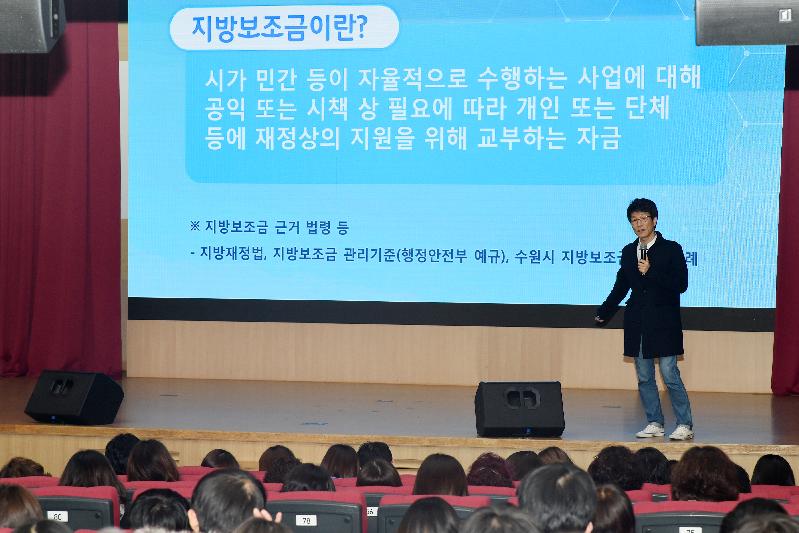 김일한(동국대 교수) 수원시지방보조금심의위원회 위원장이 강사로 나서 ▲지방보조금 제도 ▲수원시의 보조금 현황 ▲보조금 지원절차 ▲보조사업자 이행사항 ▲보조금 감사 지적사례 ▲정부의 보조금 부정수급 근절대책 등을 설명했다.