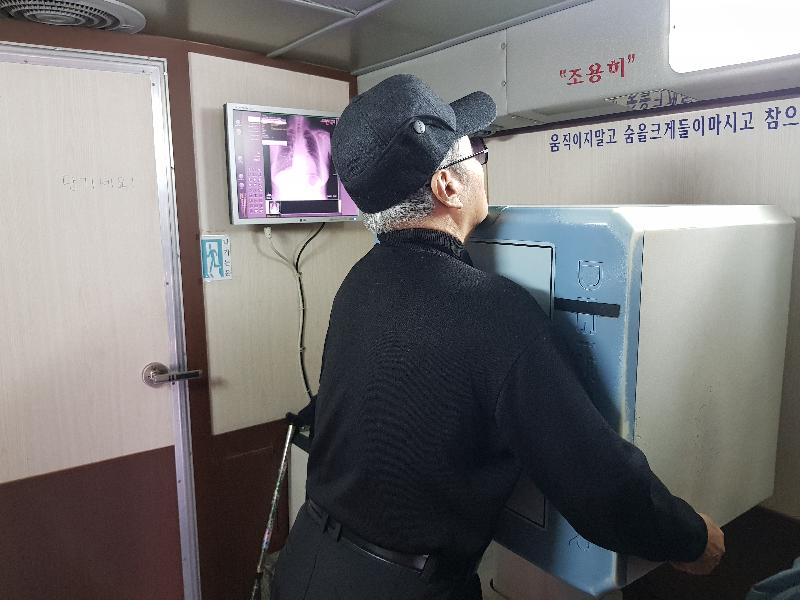 | 한 어르신이 이동검진 차량에서 X-선 검사를 받고 있다. |