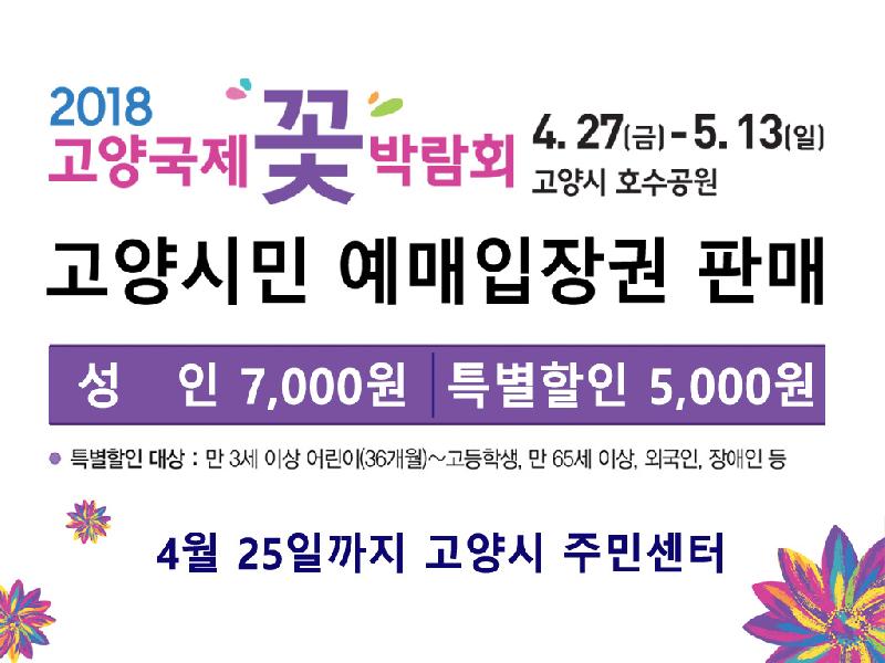 고양시(시장 최성) 덕양구는 오는 4월 27일부터 5월 13일까지 일산 호수공원에서 개최되는 ‘2018 고양국제꽃박람회’ 사전예매권을 오는 4월 25일까지 덕양구청 각부서와 각 동 주민센터를 통하여 판매한다.