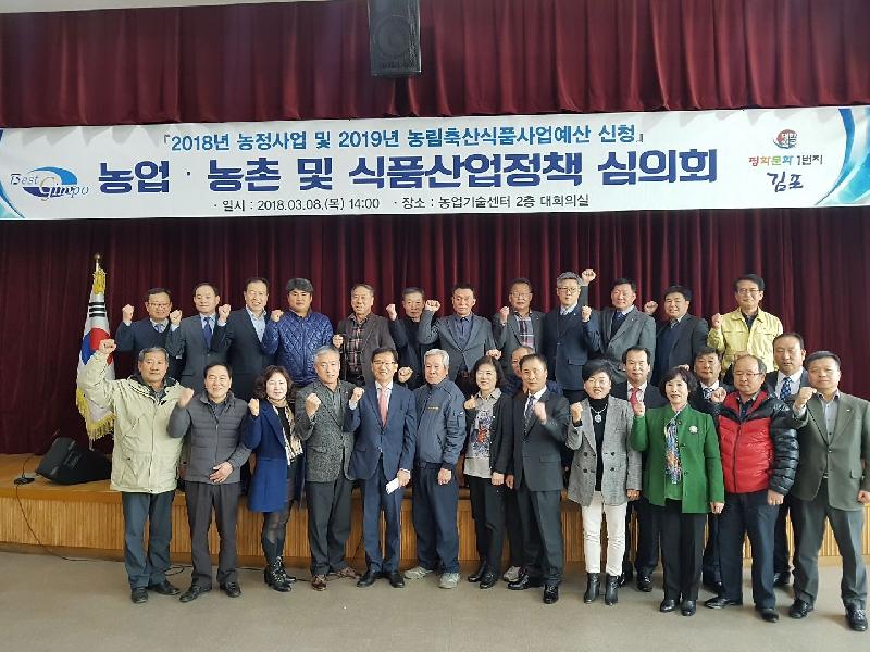 김포시(시장 유영록)가 지난 8일 농업기술센터 대회의실에서 김포시장, 유관기관, 농업 관련 단체장, 사업관련 관계부서 팀장 등 50여명이 참석한 가운데 2018년 농정사업 및 2019년 농림축산식품사업예산 신청을 위한 ”2018년 농업․농촌 및 식품산업정책심의회“를 개최했다.