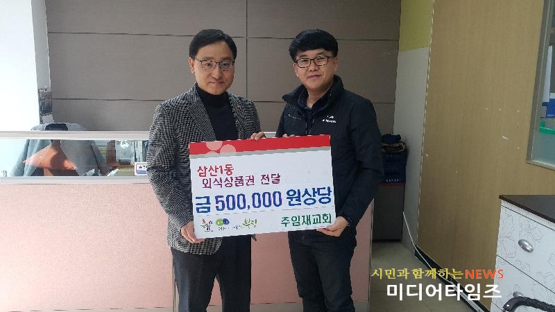 | 100만 원 상당의 외식 상품권을 전달 사진. <ⓒ미디어타임즈> |