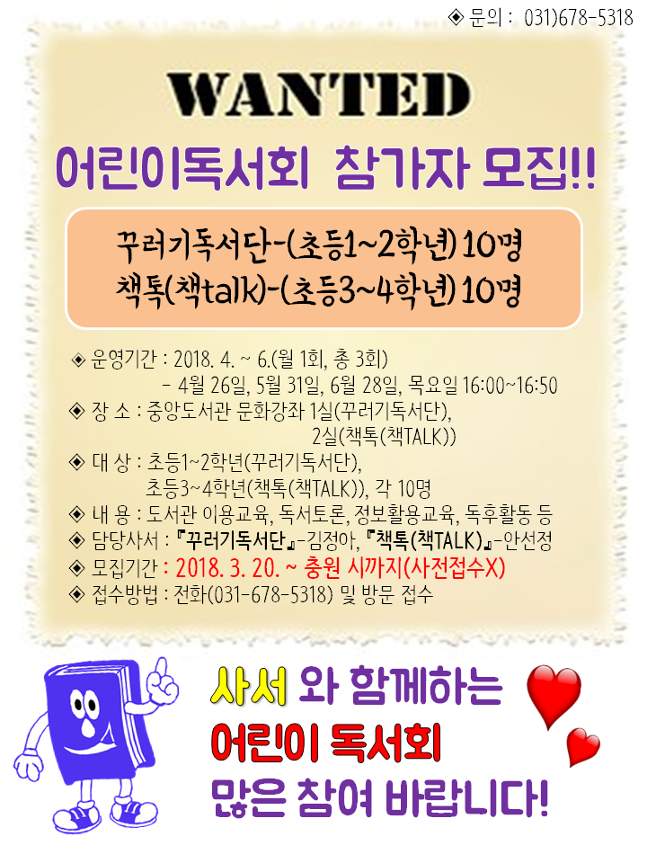 모집 예정인 어린이 독서회는 초등 1~2학년을 대상으로 하는 ‘꾸러기 독서단’과 초등 3~4학년을 대상으로 하는 ‘책톡(talk)독서회’로 매월 마지막 주 목요일 오후 4시부터 50분간 중앙도서관 문화강좌 1실, 2실에서 진행될 예정이다.