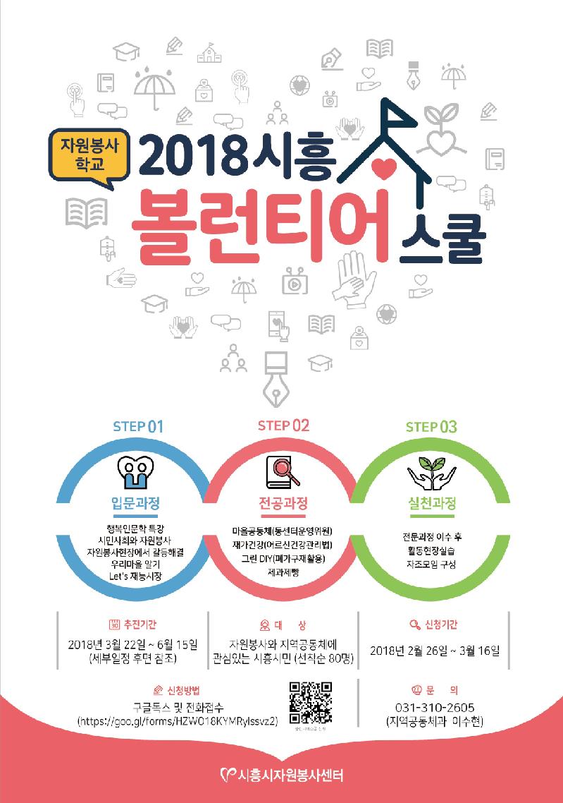 이를 위해 을 운영하며, 오는 3월 16일까지 교육생을 모집하고 있다. 자원봉사 및 지역공동체에 관심 있는 시흥시민 누구나 참여 가능하며, 구글독스(https://goo.gl/forms/vqhVATlSowDSQsKi2)로 신청하면 된다. 이번 교육은 학사운영방식을 도입하여 입문과정-전공과정-실천과정으로 진행한다.