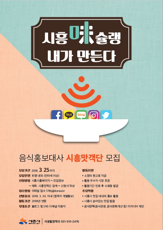 시흥시에서는 시민과 관광객에게 시흥의 맛집을 알리고 시흥 음식을 홍보하는 ‘시흥맛객단’을 모집한다.