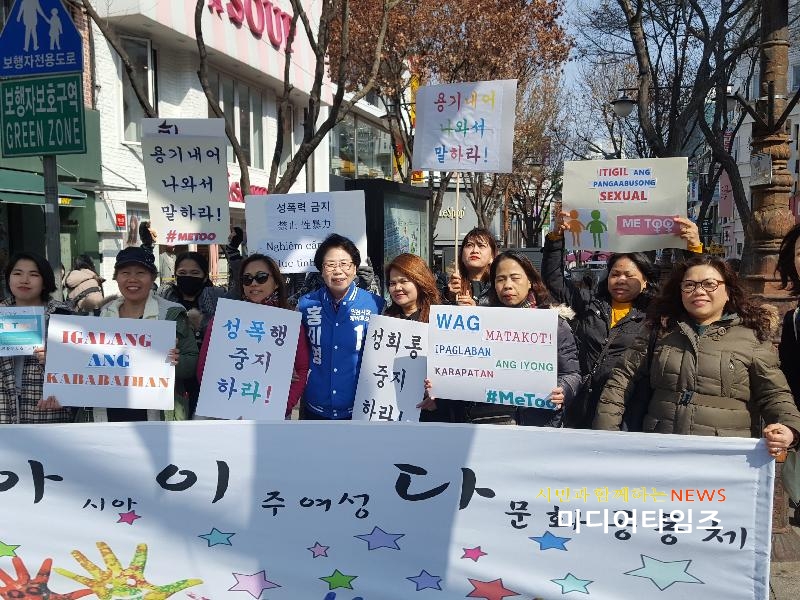 [미디어타임즈=문상수 기자] 홍미영 더불어민주당 인천시장 예비후보는 10일 오후 부평구 부평문화의 거리에서 열린 아시아 이주여성들의 ‘미투(Me Too)’ 운동에 참석, “인천시장에 당선되면 다문화가정 여성을 포함한 모든 여성들이 남성으로부터 무시당하지 않는 사람 중심의 행정을 펼치겠다”고 약속했다.홍미영 인천시장 예비후보는 이날 인사말을 통해 “한국의 여성 존중 문화가 우리나라보다 경제적으로 훨씬 어렵다는 필리핀이나 스리랑카보다도 못한 게 현실”이라며 “촛불혁명은 성폭력을 마지막 적폐로 꼽고 있다”고 주장했다.홍미영 예비후보는 “제가 인천시장에 출마한 것은 사람이 존중받는 세상, 우리 사회에서 가장 약자인 여성과 아이가 잘 사는 세상을 만들기 위해서”라고 강조했다.홍 후보는 “여성들이 성폭력에서 해방되려면 용기내서 말하는 것이 중요하다. 침묵하지 말고 함께 성폭력에 대응하자”고 호소했다.마지막으로 “한국으로 이주해 가정을 꾸리고, 아이를 키우고, 인천을 발전시켜 줘 감사하다”고 밝혔다.이날 행사는 아시아 이주여성 다문화 공동체인 ‘아이다마을’ 주최로 열렸으며 베트남, 필리핀, 중국, 일본 등의 이주여성 30여명이 참석했다.이들은 “성폭행·성희롱 중지하라”, “용기 내어 나와서 말하라” 등의 글이 적힌 손팻말을 들고 구호를 외치는 한편, 일부는 자신이 당한 성폭력 사례 등을 고발했다.‘아이다마을’은 다문화 이주여성들이 한국 생활에 잘 적응할 수 있게 서로 돌보며 차별과 폭력을 중지시키자는 목적으로 만든 아시아여성 공동체로 한국어 교육과 상담 활동 등을 벌이고 있으며 부평구에 사무실이 있다.