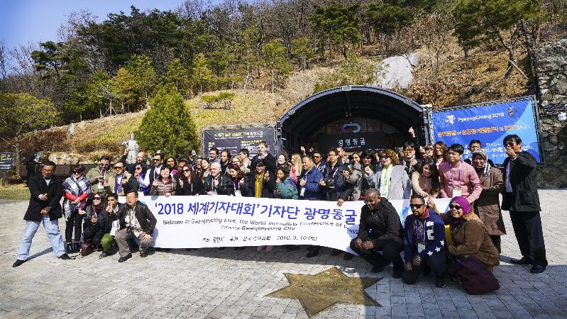 2018 세계기자대회에 참가한 46개국 외국 언론인 70여 명이 지난 10일 대한민국 최고의 동굴테마파크인 광명동굴을 방문했다.