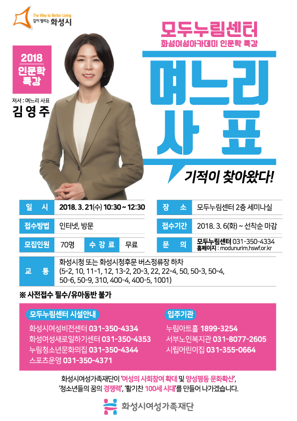 화성시여성가족재단(대표이사 노영래) 모두누림센터에서는 ‘며느리 사표 (며느리 사표를 내고 기적이 찾아왔다)’ 김영주 저자를 초청해 오는 21일 오전 10시30분부터 모두누림센터에서 화성여성아카데미 인문학특강을 개최한다.