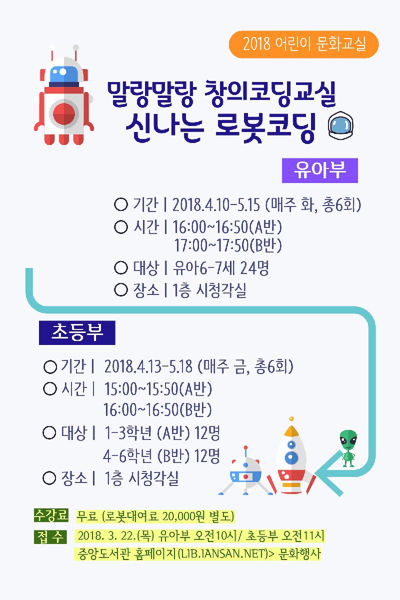 안산시 중앙도서관(관장 우호덕)은 오는 4월부터 총 6회에 걸쳐 「말랑말랑 창의 코딩교실, 신나는 로봇코딩」프로그램을 진행한다.