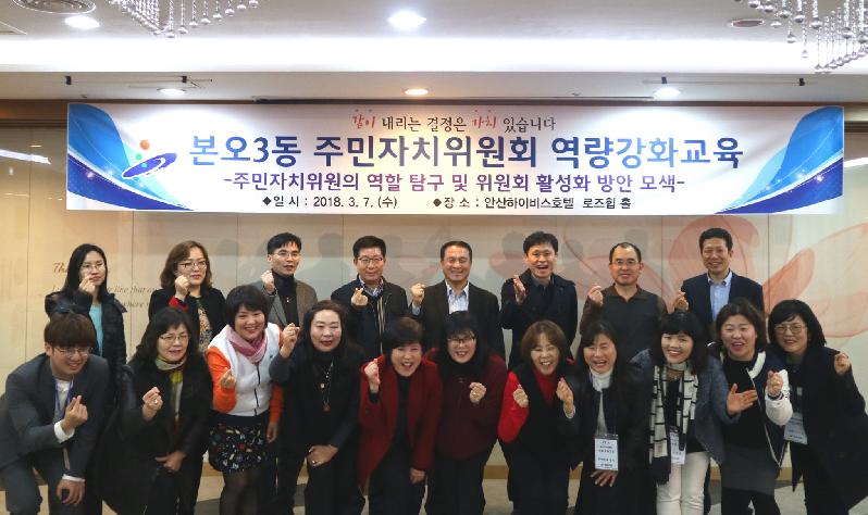 안산시 본오3동 주민자치위원회(위원장 이다경)는 지난 7일 안산에 위치한 한 호텔에서 주민자치 역량강화 교육을 실시했다.