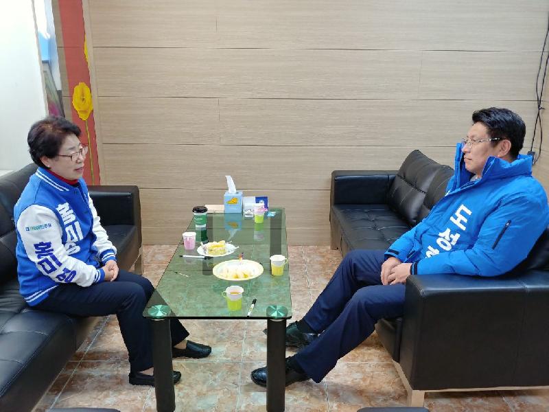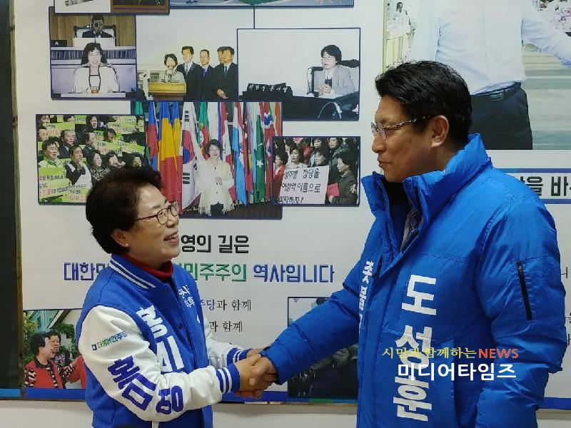 | 홍미영 인천시장 예비후보와 도성훈 인천교육감후보가 지난12일 홍 후보 사무실에서 협치를 약속하고 있다. <ⓒ미디어타임즈> |