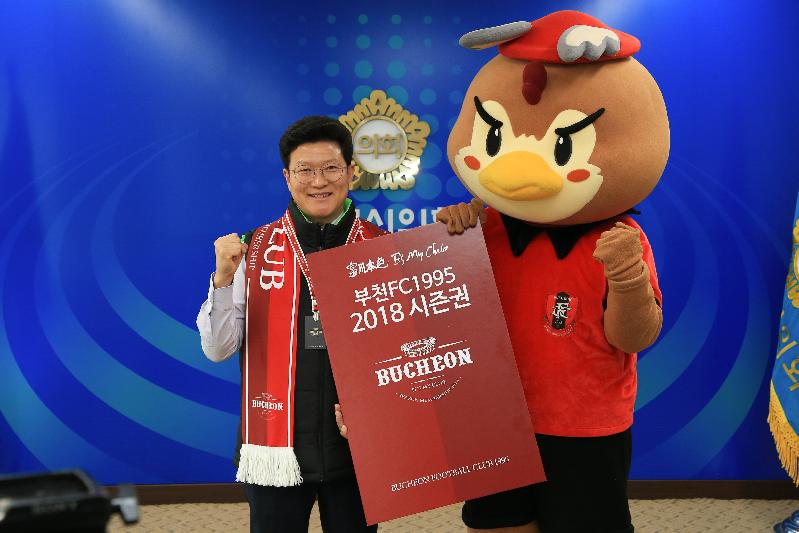 강동구 부천시의회 의장이 13일 오전 집무실에서 2018 부천FC1995의 시즌권 구매와 함께 응원 릴레이에 나섰다.