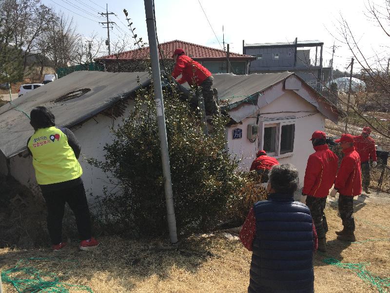 이에 하성면 지역사회보장협의체는 독거어르신의 가정을 방문해 고충을 나나누고, 관내 대민지원에 앞장서고 있는 3165부대의 협조로 아침부터 장병들이 구슬땀을 흘리며 찢어진 천막지붕을 보수한 끝에 신속하게 교체할 수 있었다.