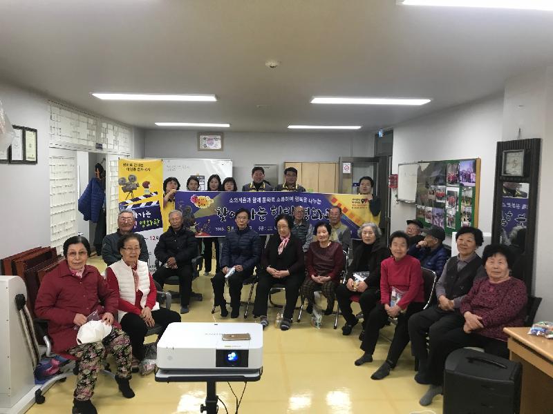 2017년도에는 청호휴먼시아, 운암주공6단지 등 5개소에서 총 5회에 걸쳐 158명의 어르신들이 영화를 관람했다. 국내 흥행작 이었던 국제시장, 명량 등을 비롯하여 다양한 장르의 영화들이 상영되었다. 올해는 시립원동 경로당, 지역아동 센터 등 총 18개소로 확대 운영, 어르신들의 접근성을 높였다.