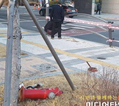 | 소화전이 차량 추돌로 파손된 현장 사진. <ⓒ미디어타임즈> |