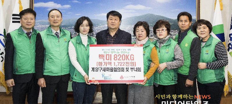 [미디어타임즈=문상수 기자] 새마을지도자계양구협의회(회장 최승기)와 계양구새마을부녀회(회장 정미령)는 이취임식에서 받은 쌀 화환과 격려금으로 마련한 백미 820kg(환가액 1,722천원)을 지난 12일 이웃돕기 성품으로 계양구청에 기탁했다.계양구새마을협의회와 부녀회는 성품기탁 외에도 지역사회 내에서 무료집수리, 김장나눔 등 다양한 봉사활동을 하고 있으며, 새마을운동 정신의 확산을 위해서 큰 역할을 하고 있다.기탁식에 참석한 최승기 협의회장과 정미령 부녀회장은 “행복한 나눔에 참여하게 되어 기쁘다”며 “앞으로도 사회공동체운동 중 하나인 나눔문화 확산을 위해 지속적인 활동을 펼쳐나갈 것이다”라고 전했다.