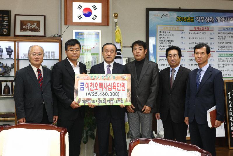 대한수의사회 경주시분회(회장 김대용)는 12일 지역 후학 육성 등을 위해 써 달라며 25,460천원의 소중한 성금을 (재)경주시장학회에 기탁했다.이번에 기탁한 정성은 경주시분회 소속 수의사들이 올해 3월 안강 산수골 농장의 돼지 구제역 발생 시 현장에서 살 처분과 매몰 작업, 반경 구역 내 백신 예방접종 등에 직접 참여한 개인 인건비를 십시일반 모은 소중한 성금이다.경주시분회는 평소에도 가축 질병예찰 및 각종 전염병 예방접종 등 가축 질병예방등 방역행정에 적극 협조하고 있으며, 올해 3월에는 안강 산수골 농장의 구제역 발생으로 돼지 16,749두의 살 처분과 매몰 작업에 참여하였고, 발생농장 3km 이내의 사육농가 330호에 12,719두 백신접종 예방 등 구제역 조기 종식과 타 지역 확산방지에 중추적인 역할을 하였다.김대용 회장은 “이번 장학금은 구제역 긴급 방제 등에 참여한 회원들의 인건비로 많지는 않지만 지역교육 발전에 버팀목이 되었으면 좋겠다.”고 소회를 전했다.최양식 경주시장은 “구제역 살 처분 및 매몰 작업의 신속한 처리와 긴급 백신접종 등을 통해 구제역 조기 종식에 적극 협조하여 준데 감사를 드리며, 특히 회원 개개인들의 인건비를 서슴지 않고 지역의 후학 양성과 교육의 백년대계를 위해 성원해 준 소중한 장학기금을 뜻 있는 곳에 사용하겠다.”며 고마움을 전했다.// 김희철 기자 khc4236@hanmail.net