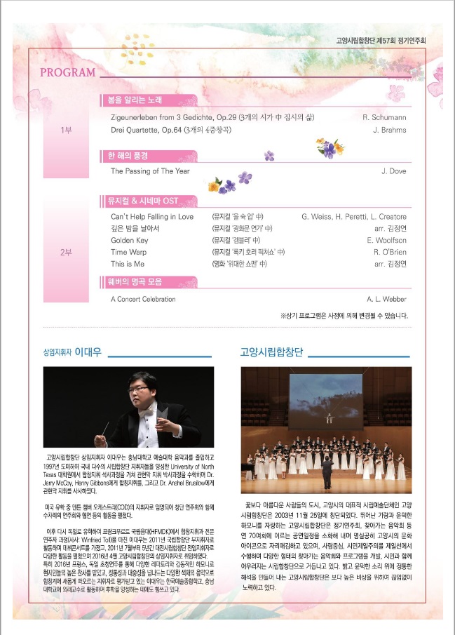 따뜻한 4월의 봄날, 고양시(시장 최성)의 대표적인 예술단체 고양시립합창단이 4월 5일(목) 저녁 8시 고양 아람누리 아람음악당(하이든홀)에서 성공적인 고양국제꽃박람회 개최를 기원하며 제57회 정기연주회, ‘Song of Spring’을 개최한다.